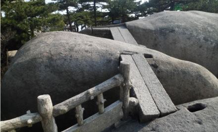 天池峰,為天柱山的第二高峰,它稍高于飛來峰,海拔1426米。天池峰,一裂為三,由兩段石條連接在一起,稱為“渡仙橋”,登上天池峰頂,可觀日出、云海、佛光、晚霞景觀?邕^渡仙橋,即達方圓不足10平方米的一平臺,臺中大小兩個石坑,稱“天池”。天池平臺外沿是懸崖絕壁,稱試心崖。試心崖可觀賞“天柱山佛光”景觀。