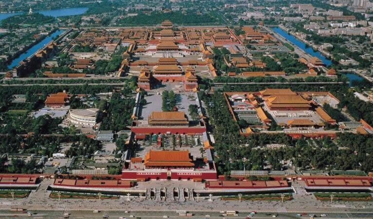 故宮位于北京城中心,布局依據(jù)《周禮·考工記》中所載:“左祖、右社、面朝、后市”的原則,建筑在北京城南北長八公里的中軸線上,南北取直,左右對稱。如今故宮左前面的勞動人民文化宮,明清是皇帝祭祀祖宗的太廟;右前面的中山公園是皇帝祭祀土神和谷神的社稷壇;前面有朝臣辦事的處所;后面有人們進行交易的市場。北京故宮的北面是萬歲山,南面是金水河,恰好符合古人“負陰抱陽,沖氣為和”的建宮原則,萬歲山是專門為營造皇城風水而筑城的一座人工山,完成于明初,位于元代寢宮延春閣舊址,用開挖護城河和南湖的淤泥堆積而成。此山的堆筑,一方面滿足了皇城要“負陰”的原則,另一方面又鎮(zhèn)住了前朝的風水,故萬歲山又有“鎮(zhèn)山”之稱。北京四九城的布局是二龍出水護著紫禁城。依照中國古代星象學(xué)說,紫微星(即北極星)位于中天,乃天帝所居,天人對應(yīng),是以皇帝的居所又稱紫禁城。
