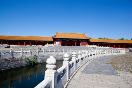太和門前有面積約26000平方米的廣場,內(nèi)金水河自西向東蜿蜒流過。河上橫架五座石橋,習稱內(nèi)金水橋。廣場兩側(cè)是排列整齊的廊廡,習稱東、西朝房,并有協(xié)和門(明代稱會極門)和熙和門(明代稱歸極門)東西對峙。東側(cè)廊廡在明代用作實錄館、玉牒館和起居注館,清代改作稽察欽奉上諭事件處和內(nèi)誥敕房。西側(cè)廊廡在明代為編修《大明會典》的會典館,清代改為繙書房和起居注館。