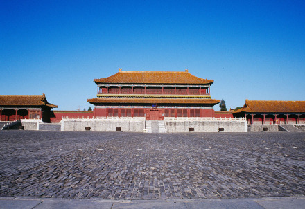 午門是故宮的正門。俗稱五鳳樓。東西北三面以12米高的城臺相連,環(huán)抱一個方形廣場。有1組建筑。正中有重樓,是9間面寬的大殿,重檐廡殿頂,在左右伸出兩闕城墻上,建有聯(lián)檐通脊的樓閣四座,明廊相連,兩翼各有13間的殿屋向南伸出,四隅各有高大的角亭,輔翼著正殿。這組城上的建筑,是故宮宮殿群中第一高峰。午門是皇帝下詔書、下令出征的地方。它當中的正門平時只有皇帝才可以出入;皇帝大婚時皇后進一次;殿試考中狀元、榜眼、探花的三人可以從此門走出一次。文武大臣進出東側(cè)門,宗室王公出入西側(cè)門。