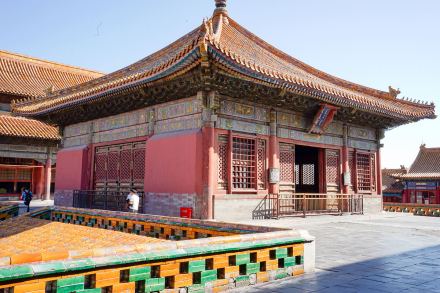 交泰殿為內(nèi)廷后三宮之一,位于乾清宮和坤寧宮之間,約為明嘉靖年間建。交泰殿平面為方形,深、廣各3間。明間設(shè)寶座,上懸康熙帝御書“無為”匾,寶座后有板屏一面,上書乾隆帝御制《交泰殿銘》。交泰殿為皇后千秋節(jié)受慶賀禮的地方。清代于此殿貯清二十五寶璽。每年正月,由欽天監(jiān)選擇吉日吉時,設(shè)案開封陳寶,皇帝來此拈香行禮。清世祖所立“內(nèi)宮不許干預(yù)政事”的鐵牌曾立于此殿;实鄞蠡闀r,皇后的冊、寶安設(shè)殿內(nèi)左右案上。每年春季祀先蠶,皇后先一日在此查閱采桑的用具。