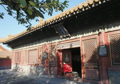 景陽宮,為內(nèi)廷東六宮之一,位于鐘粹宮之東、永和宮之北。明永樂十八年(1420年)建成,初名長陽宮,嘉靖十四年(1535年)更名景陽宮。明代為嬪妃所居。清代改作收貯圖書之地。宮為二進院,正門南向,名景陽門,前院正殿即景陽宮,面闊3間,黃琉璃瓦廡殿頂,與東六宮中其它五宮的屋頂形式不同。后院正殿為御書房,面闊5間,明間開門,黃琉璃瓦歇山式頂。次、梢間為檻墻、檻窗,檐下施以斗栱,飾龍和璽彩畫。東西六宮年節(jié)張掛的《宮訓(xùn)圖》原收藏于此。