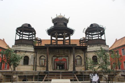 延禧宮為內(nèi)廷東六宮之一,建于明永樂十八年(1420年),初名長壽宮。殿前有東西配殿各3間。后院正殿5間,亦有東西配殿各3間,均為黃琉璃瓦硬山頂。宣統(tǒng)元年(1909年)在延禧宮原址興工修建一座3層西洋式建筑——水殿。水殿四周浚池,引玉泉山水環(huán)繞。主樓每層9間,底層四面當中各開一門,四周環(huán)以圍廊。隆裕太后題匾額曰“靈沼軒”,俗稱“水晶宮”。1917年張勛復(fù)辟時,延禧宮北部被直系部隊飛機投彈炸毀。