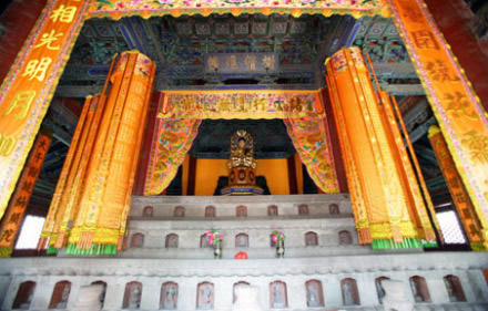 大雄寶殿:在天王殿后面,坐落在近兩米高的月臺上。門額上高懸清乾隆帝手書“蓮界香林”雕龍橫匾。原來還掛有清康熙帝所題“般若無照” 匾額和“禪心似鏡留明月,松韻如莫振舞風(fēng)”的楹聯(lián),今已不存。殿內(nèi)屋頂上有三個木雕藻井,上圓下方,井內(nèi)各雕有一條團(tuán)龍。下方漢白玉石雕的須彌座上供有明代鑄造的銅質(zhì)橫三世佛。正中為釋迦牟尼佛,南側(cè)為阿彌陀佛。北側(cè)為藥師佛。每尊佛像高3.2米,重5000公斤。大殿前左右兩側(cè)各有三間配殿,左側(cè)為伽藍(lán)殿,右側(cè)為祖師殿。