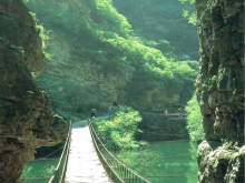 棧道:京東大峽谷以五潭稱奇,然而跨四潭的棧道也稱標新立異,各不相同,成為大峽谷的又一奇觀,一、二棧道依崖而成,似長龍臥坡,四潭棧道由數(shù)十根鋼索相連而成,攀崖而上,跨潭而過,似臥頂長虹,走在上面搖搖晃晃,險象橫生,難免不讓人想起紅軍強渡“大渡河”、勇過鐵索橋的壯舉,游客們身臨其境,其感覺自當終生難忘。
