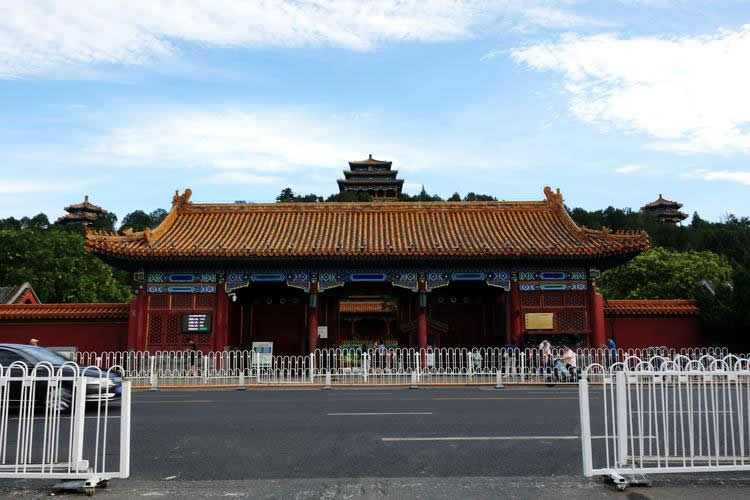 ①景山門。位于北京故城垣中軸線上,是公園的南門和正門。其南為故宮北門(神武門),其北為園內綺望樓。坐北朝南。黃琉璃筒瓦歇山頂。面闊5間,進深3間。單昂三踩斗拱,旋子彩畫。