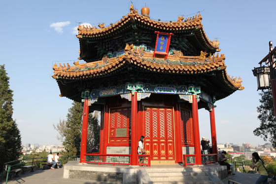 萬春亭:位于景山的中峰,中峰的相對高度為45.7米,是北京城南北中軸線上最高和最佳的觀景點。萬春亭位于景山最高處,建于乾隆十五年(1750年),是北京南北建筑中軸線的基點。被譽為北京中軸線上的制高點,京華覽勝第一處。亭高15.38米,平面呈四方形,為三重檐四角攢尖頂,上檐和中檐均為九踩三昂斗拱,下檐為七踩重昂斗拱,黃琉璃瓦覆頂綠剪邊,檐上有琉璃寶頂,建筑面積296.5平方米。萬春亭的彩繪稱為:旋子大點金龍錦枋心,這也是中國皇家等級最高的彩繪形式。萬春亭內供奉著“毗盧遮那佛”,毗盧遮那佛也稱為大日如來佛,是釋迦牟尼佛的法身。毗盧遮那佛為密宗金剛界五方如來之首,在五方佛中代表法界體性智。亭中所供原佛像于二十世紀六十年代被損毀,重塑歸安后于2000年正式對外開放。