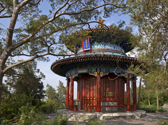 富覽亭:西側第一座亭。孔雀藍琉璃筒瓦頂,紫晶色琉璃瓦剪邊,重檐圓攢尖頂。富覽亭建于乾隆十五年(1750年),為景山五方亭之一,與東側的周賞亭相對而建,兩座亭子的建筑形式和彩繪完全相同,為重檐圓攢尖頂,孔雀藍琉璃瓦覆頂,紫晶色琉璃瓦剪邊,亭高11.75米,建筑面積76.36平方米。富覽亭內原供奉五方佛之一的不空成就佛,為鑄銅鎦金佛像。佛像于1900年(光緒二十六年)被八國聯(lián)軍劫去。不空成就佛是北方如來,又稱天鼓雷音佛、天鼓音佛、雷音王佛等名,在五智如來中代表 “成所作智”。 不空成就佛以大慈方便,使佛門修行者舍除懈怠貪欲,遠離一切煩惱,從而道業(yè)精進,以大智慧成就一切如來事業(yè)與眾生之事業(yè)。