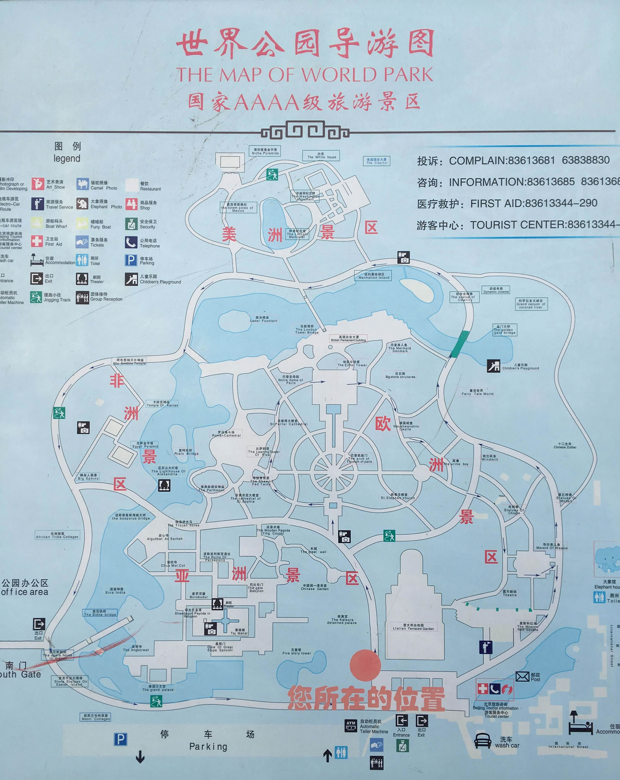 步入公園大門(mén),迎面便是寬闊壯麗的意大利臺(tái)地園,然后順時(shí)針?lè)较蜻M(jìn)入亞洲景區(qū),首先見(jiàn)到日本的桂離宮,依次是中國(guó)園林清音境、萬(wàn)里長(zhǎng)城、莫高窟、應(yīng)縣木塔,還有波斯波利斯宮遺址(伊朗)、婆羅浮圖(印度)、巴比倫門(mén)(伊拉克)、泰姬陵(印度)、仰光大金塔(緬甸)、吳哥寺(柬埔寨)、泰國(guó)大王宮;然后跨過(guò)悉尼鐵橋進(jìn)入“澳洲”,可以觀賞毛利草屋(新西蘭)、悉尼歌劇院(澳大利亞);接著進(jìn)入“非洲”沙漠,巡看非洲部落、獅身人面像(埃及)、吉薩金字塔(埃及)、阿布·西姆貝爾神殿(埃及)、卡納克神廟(希臘)和亞歷山大燈塔(埃及);超過(guò)博斯普魯斯海峽大橋,就進(jìn)入到“歐洲”,可以欣賞到特洛伊木馬(土耳其)、圣·索菲亞大教堂(烏克蘭)、雅典衛(wèi)城(希臘)、羅馬競(jìng)技場(chǎng)(意大利)、比薩斜塔(意大利)、圣·彼得大教堂(俄羅斯),便游到公園中心凱旋門(mén)(法國(guó)),依次游布直塞爾第一公民景點(diǎn)(比利時(shí)),德國(guó)城堡、埃菲爾鐵塔(法國(guó))、巴黎圣母院、大本鐘(英國(guó));漫步倫敦塔橋,便進(jìn)入“美洲”,依次可以看到美國(guó)的宇航中心,林肯紀(jì)念堂、華盛頓紀(jì)念碑、白宮、國(guó)會(huì)大廈、紐約曼哈頓區(qū)和自由女神像,穿過(guò)科羅拉多大峽谷(美國(guó)),邁過(guò)金門(mén)大橋(美國(guó)),便到了十二生肖像,看到荷蘭風(fēng)車(chē),又可贍仰德國(guó)音樂(lè)家肖邦像和莫扎侍像,還可看到“華沙 美人魚(yú)”,最后到達(dá)“莫斯科紅場(chǎng)”。漫游“世界”一周后,再到“國(guó)際街”購(gòu)物、小吃、休憩,感嘆世界真奇妙不看不知道。