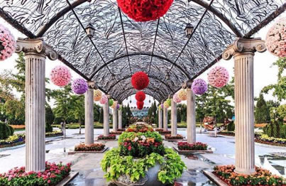 中國園林占地450平方米,采用我國南方傳統(tǒng)建筑風(fēng)格的白墻、灰瓦和花窗,極富江南韻味,古老的月亮門勾起您的懷舊情思。進入花園,曲徑通幽的小道蜿蜒伸向遠方,滿園的月季花鮮艷奪目。
