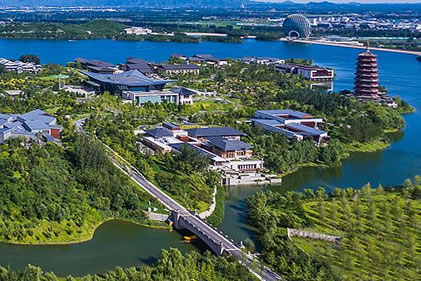 雁棲島上 核心是 雁棲湖國際會議中心。服務于大型會議。建筑主體是 “漢唐飛揚”,前面是夏園?偨ㄖ娣e4.2萬平方米,大小會議室、餐廳20余間,可以同時滿足近千人舉行會議和用餐。會議中心建筑內(nèi)部以H型為布局,功能核心區(qū)由位于一層的宴會廳——“鴻雁廳”和位于二層的會議大廳——“集賢廳”組成,兩側為貴賓大廳、休息區(qū)、大小會議室、包間等功能空間,宴會廳南側設室外宴會草坪,可以舉辦室外酒會等活動。