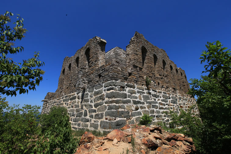 九眼樓長(zhǎng)城 九眼樓長(zhǎng)城位于四海鎮(zhèn)火焰山頂部。因敵樓每面有9個(gè)箭窗,故名。又因山勢(shì)高峻,晴天可望到北京城,故也稱望京樓。為長(zhǎng)城重要關(guān)口之一。海拔1141米,F(xiàn)樓內(nèi)有灶炕、居室遺跡,近處有馬場(chǎng)、晾馬場(chǎng)、軍營(yíng)(營(yíng)城)遺跡。樓北側(cè)有明代官員徐申于萬(wàn)歷十三年(公元1585年)巡行到該地書寫的大理石碑一方。 九眼樓為正方雙層建筑,因每邊有九個(gè)了望孔而得名,現(xiàn)存一層,高度為7.8米,每邊為13米,了望孔高1.65米,寬0.5米,內(nèi)有軍士來(lái)往巡視寬1.2米的環(huán)行步道。九眼樓下部砌石條,上部用白灰砌青色城磚,構(gòu)建十分堅(jiān)固而壯美。樓下西側(cè)有小平臺(tái),為軍士集中的場(chǎng)地。平臺(tái)北側(cè),有磚砌的臺(tái)階,沿臺(tái)階可達(dá)樓南門。樓頂為磚砌券拱式結(jié)構(gòu),樓內(nèi)寬大,可住兵儲(chǔ)器,向北開(kāi)兩窗,四面各有一門,門高兩米,闊1.2米,出入極便利。 |