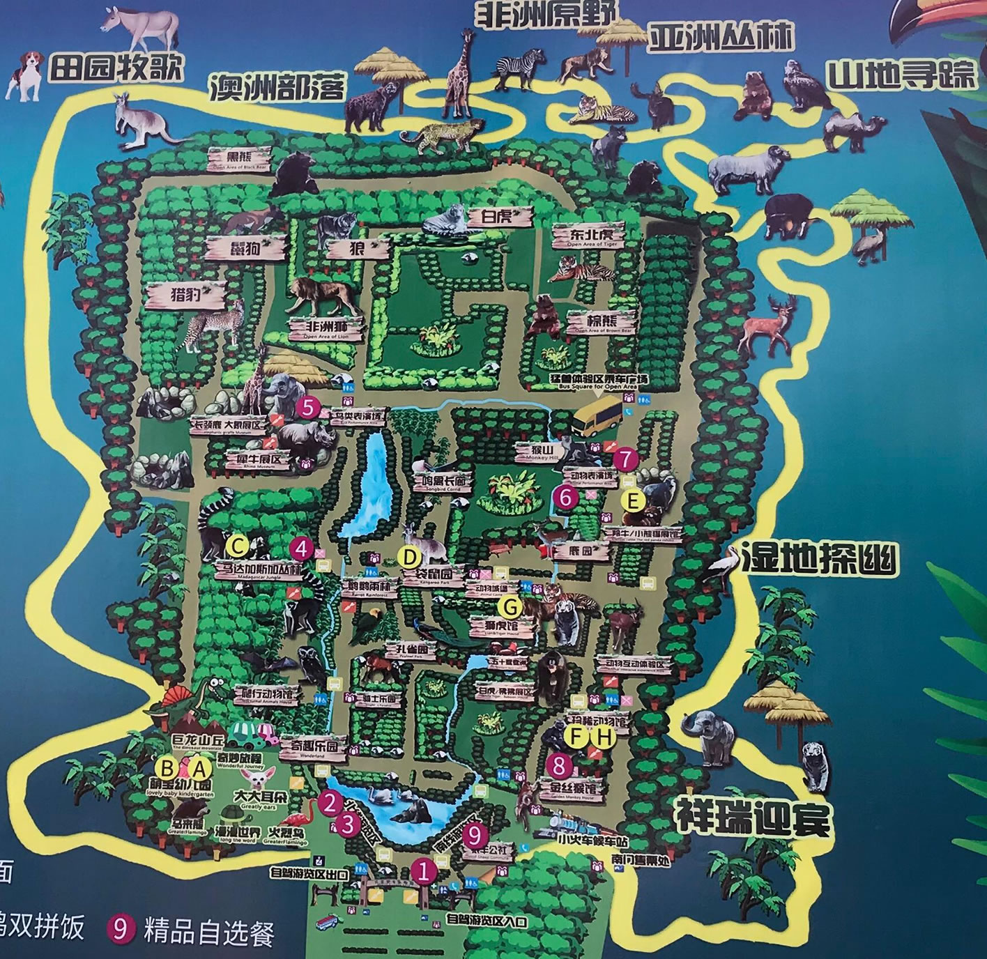 園區(qū)突出一個(gè)“野”字,體現(xiàn)一個(gè)“愛”字,以“保護(hù)動物、保護(hù)森林”為宗旨,突出了“動物與人、動物與森林” 的回歸自然主題,渲染“人、動物、森林”的氛圍,拉近人與動物的距離。