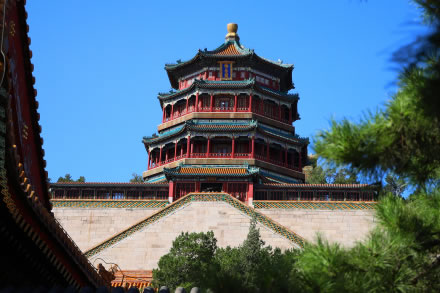 佛香閣位于在萬(wàn)壽山前山中央部位的山腰,建筑在一個(gè)高21米的方形臺(tái)基上,是一座八面三層四重檐的建筑;閣高41米,閣內(nèi)有8根巨大鐵梨木擎天柱,結(jié)構(gòu)復(fù)雜,為古典建筑精品。原閣咸豐十年(1860年)被英法聯(lián)軍燒毀后,光緒十七年(1891年)花了78萬(wàn)兩銀子重建,光緒二十年(1894年)竣工,是頤和園里最大的工程。閣內(nèi)供奉著“接引佛”,供皇室在此燒香。