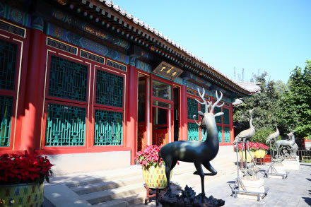 堂前有慈禧乘船的碼頭“樂(lè)壽堂”黑底金字橫匾為光緒手書。樂(lè)壽堂庭院內(nèi)陳列著銅鹿、銅鶴和銅花瓶,取意為“六合太平”。院內(nèi)花卉植有玉蘭、海棠、牡丹等,名花滿院,寓“玉堂富貴”之意。