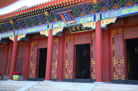 東宮門門楣檐下全部用油彩描繪著絢麗的圖案,六扇朱紅色大門上嵌著整齊的黃色門釘,中間檐下掛著九龍金字大匾,上書“頤和園”三個(gè)大字,為光緒皇帝御筆親題。門前御道丹陛上的云龍石雕刻著二龍戲珠,為乾隆年代所刻,是從圓明園廢墟(安佑宮)上移來(lái)的,它是皇帝尊嚴(yán)的象征。東宮門當(dāng)年只供清朝帝后出入。