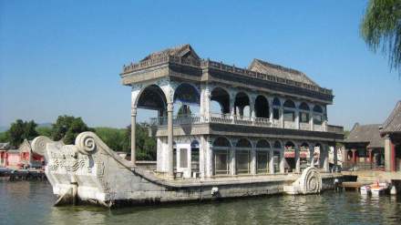 清晏舫俗稱石舫,在長(zhǎng)廊西端湖邊,是一條大石船,寓“海清河晏”之意,是頤和園唯一帶有西洋風(fēng)格的建筑。它的前身是明朝圓靜寺的放生臺(tái)。乾隆修清漪園時(shí),改臺(tái)為船,更名為“石舫”。石舫長(zhǎng)36米,船用大理石雕刻堆砌而成。 船身上建有兩層船樓,船底花磚鋪地,窗戶為彩色玻璃,頂部磚雕裝飾。下雨時(shí),落在船頂?shù)挠晁ㄟ^(guò)四角的空心柱子,由船身的四個(gè)龍頭口排入湖中。