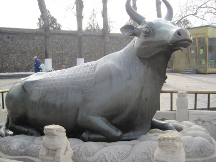 銅牛在昆明湖東岸,十七孔橋東橋頭北側(cè),為鎮(zhèn)壓水患而設(shè)。乾隆二十年1755年用銅鑄造,稱為“金!。