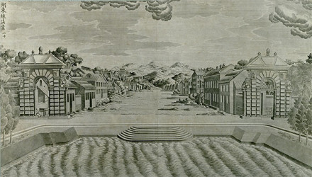 位于水木明瑟東面,是園中專門開辟的一座小城鎮(zhèn),仿照古印度橋薩羅國首都的城池布局而建,是供奉各種佛像和收藏佛經(jīng)的地方。城廓呈長方形,南北長、東西寬,四周筑有城墻,共辟4門。城內(nèi)街道呈十字形,內(nèi)建殿宇、房舍共326間,用游廊相連接;還建有數(shù)座金碧輝煌的牌樓。城前專門開設(shè)一條貫穿南北的買賣街,稱蘇州街,由宮中太監(jiān)扮作商人開市叫賣,法國教士王致誠對買賣街有比較詳盡的記載。