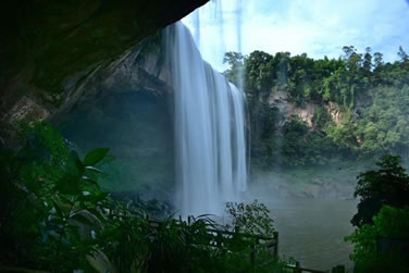 水簾洞位于瀑布下方,由整塊的巨巖組成。巨巖由砂巖青石構成,面積有上萬平方米。水簾洞內能以360度的全景視角觀賞到大瀑布“飛流直下三千尺,疑是銀河落九天”的恢宏氣勢,體驗與瀑布親密接觸的清爽,領略春雨瀟瀟、秋雨綿綿、夏雨磅礴的四季風雨情致,有奇妙的季節(jié)穿越之感。