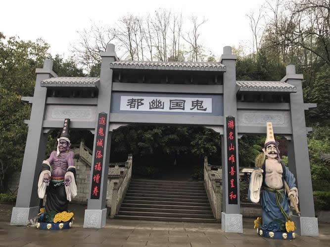 相傳漢代有陰長生、王方平兩人曾先后在此修道成仙,白日飛升。至唐代,因有人誤將“陰”“王”兩姓聯(lián)綴為“陰王”,于是名山就逐步被傳說誤會為“陰王”(陰間之王)所居之地,即演變成“陰曹地府”的鬼都。并在其后的歲月中,陸續(xù)建起了許多與“陰曹地府”相關(guān)的寺廟殿宇。