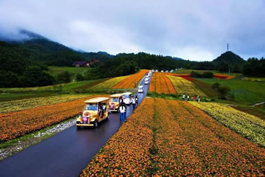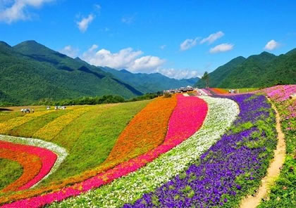 嫣彩織帶:各色鮮花呈帶狀鋪滿,五顏六色,艷麗斑駁。一條條彩帶猶如多條絲綢鋪展在草地上,在綿延起伏的山脈下形成一片彩色的海洋。近百畝的帶狀簡單構(gòu)圖,鋪天蓋地的霸氣給人豐富遐想,更像一條巨大的飄帶,給景區(qū)增加色彩的壯麗與斑斕。