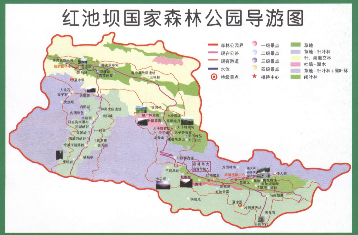 紅池壩草場由紅池壩、天子山、西流溪三大塊草場組成,面積達(dá)30余萬畝,是全國首屈一指的高山草場。盛夏,紅池壩茫茫草原、姹紫嫣紅、翠綠 夏冰洞欲滴,最高溫度僅為10余攝氏度,是難得的避暑勝地;秋天,天高氣爽、蜂飛蝶舞,在此可縱馬馳騁;冬天一派銀裝素裹,北國風(fēng)光,是滑冰、滑雪的理想地方。在距草場不遠(yuǎn)處還有聞名中外的世界奇觀——夏冰洞,每逢盛夏,洞中滴水成冰,滿目冰川、姿態(tài)萬千,而待數(shù)九隆冬,洞內(nèi)卻冰融水暖、細(xì)流涓涓,勝似溫泉,至今仍是一個謎。這里還是四條河流的發(fā)源地,“四異之水源于此”,巫溪縣原主管旅游的副縣長、現(xiàn)縣人大主任傅主任如是向記者介紹道,南到云陽的湯溪河、大寧河的源頭——西溪河、大寧河主要支流——后溪河、仁河這四條流向不同的河流均發(fā)源于此。