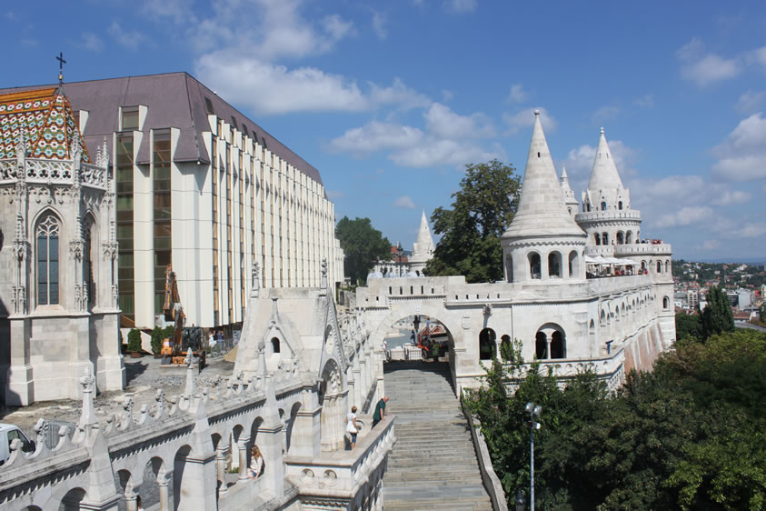 漁人堡 漁人堡(Halászbástya)是一個新哥特式和新羅曼風(fēng)格的觀景臺,位于匈牙利首都布達(dá)佩斯布達(dá)一側(cè)多瑙河河畔的城堡山,鄰近馬加什教堂。它修建于1895年到1902年之間,設(shè)計師是弗里杰·舒勒克(Frigyes Schulek)。第二次世界大戰(zhàn)期間,漁人堡近乎毀滅。1947年至1948年之間,弗里杰·舒勒克的兒子亞諾什·舒勒克負(fù)責(zé)了修復(fù)工程。 如今,城堡的一部分作為餐廳使用;乩壤镉薪^佳的觀景角度,而瑪加什教堂與漁人城堡間的銅像,則是第一位匈牙利國圣·伊斯特萬一世,圣·史迪分國王雕像(King St. Stephen’s statue)圣·史迪分國王是匈牙利第一個天主教國王(公元1000年加冕),同時也可以說是匈牙利國的建立者。漁人堡旁的希爾頓旅館,外層是茶色的帷幕玻璃映照著漁人堡和一旁的教堂倒影,美麗而迷人。 從塔和觀景臺,可以看到多瑙河、瑪格麗特島、東面的佩斯,以及蓋勒特丘陵(Gellért Hill)的全景。