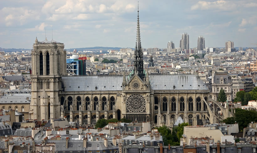 巴黎圣母院 巴黎圣母院(法語:Cathédrale Notre Dame de Paris),又名巴黎圣母主教座堂、巴黎圣母院大教堂,位于法蘭西共和國首都巴黎市中心城區(qū),地處塞納河中央西堤島上,與巴黎市政廳和盧浮宮隔河相望,為哥特式基督教教堂建筑;始建于1163年3月24日(羅馬教皇亞歷山大三世四年),是基督教支派天主教巴黎總教區(qū)主教座堂、法國首都最悠久和最具象征意義的紀(jì)念碑之一、歐洲最著名的哥特式大教堂之一、法國最具代表性的文物古跡和世界遺產(chǎn)之一,法國及歐洲文學(xué)文化地標(biāo)建筑。 巴黎圣母院平面為長形馬蹄哥特式拉丁十字形制,總長約127米,總寬約48米,總高達(dá)96米,總建筑面積達(dá)5500平方米,總占地面積達(dá)6000平方米;西立面置有兩座鐘塔,高約69米;內(nèi)部共有五個(gè)縱艙,包括一個(gè)中艙與兩側(cè)各兩個(gè)的翼艙,十字的頂部是祭壇,十字長翼是圣母院長方形主殿;東端是圣壇,后為半圓形的外墻,橫廳兩個(gè)盡段都有開門,旁置小塔;圣壇外有標(biāo)志性尖塔,高96米。巴黎圣母院是世界上第一座完全意義上的哥特式教堂,建筑本體的雕刻藝術(shù)和繪畫藝術(shù)及堂內(nèi)珍藏的大量藝術(shù)珍品具有極高的歷史文化價(jià)值和蜚聲中外的世界聲譽(yù),是法國巴黎的象征,世界主流宗教基督教圣地。