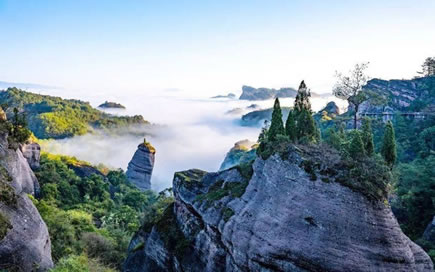 冠豸山屬于丹霞地貌,其自然形態(tài)之美在于山之奇險與幽秀,水之清冽與甘甜。遠望冠豸,山并不高。登上盤旋的山路,走過“蒼玉峽”,來到“半云亭”時,便自然產(chǎn)生“云層覺路嶺千尋”的感覺。丹梯云棧緊與半云亭相連,峭壁之上,開鑿磴道,垂直如梯,右邊是懸崖,巖色赤潤,左邊是絕谷,谷深萬丈。行走在云棧之間,有如行走在古木蒼郁的樹梢之上,行走在半空的云霧之間。