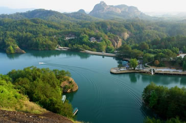共有蜘蛛巖、水上金字塔、鄂魚峰、金鼠巖、九龍獻瑞、佛洞、八仙巖等景點20多處,是冠豸山風景區(qū)又一顆璀璨明珠。 九龍湖內(nèi)港汊眾多,彎彎曲曲,處處是“水上迷宮”,曲徑通幽,是一個珊瑚狀的湖泊,而主要有四大龍溏坑、飛龍坑、九龍灣坑和碧螺坑。主要景點有: 九龍獻瑞:位于大壩口,九條如巨龍走勢的山脈齊聚于次,而其中一條飛龍最為生動形象,蜿蜒曲伸,猶如從天而降猛龍,正潛翔入海,栩栩如生。 金猴戲犬:大壩側(cè)一組丹霞石柱、石壁楊成一幅美妙、畫圖。正中石柱活象一位魁梧壯漢,為九龍湖守護神。在它的腳下是“金猴戲犬”圖,金猴激戰(zhàn)天兵天將,面對一群兇神惡煞的圍攻,騰身一躍,站于“哮天犬”尾巴上搔首弄姿,戲弄敵人。 如意壁:在一塊山崖下方,壁立平整,棱角分明。象一扇洞府山門。(也有人稱它為“無字碑”) 靈蚌含珠:一小山丘形似靈蚌,碩大豐滿,勃勃生機,猶如正在孕育著無數(shù)個珠的蚌母。 飛龍顯身:九條獻瑞中,其一起在半腰中突然裸露出100余米長龍身。猶如正在它的敵人酣斗中突然顯出原形,威風凜凜震懾對方。這是一道“丹霞山脊”也稱“石梁”,如攀登這段石梁比黃山“鯽魚背”更險更奇。