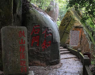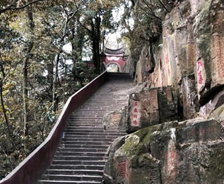 第四亭:“半山亭”。由第三亭至此,共有494級(jí)臺(tái)階。亭在半嶺,故名。過此亭百余階,有石刻“路通仙苑”,轉(zhuǎn)小徑可達(dá)“十八洞景”。“半山亭”后近300階有石刻“桃?guī)r洞口”,往東可到桃?guī)r洞,桃花精舍。