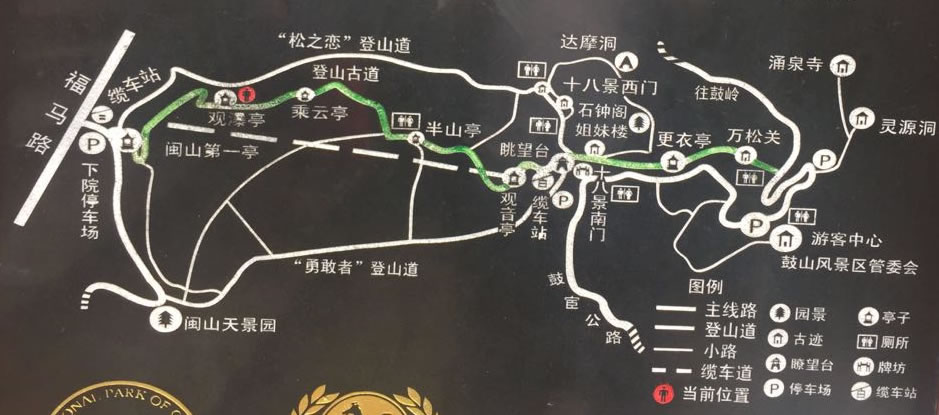 5.廨院——絕頂峰 鼓山下院下車,經(jīng)新登山道西線登山,經(jīng)茶亭、更衣亭到“石鼓名山坊”后至山門、千年楓樹、松濤亭。從絕頂峰下面經(jīng)過到鳳池,由老古山、白云洞下山。