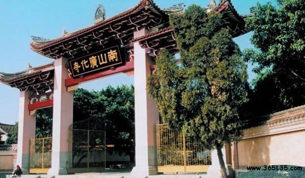 南山廣化寺:座落在城南鳳凰山,F(xiàn)行建筑群是清光緒初年依舊制重修的,從20世紀80年代開始,進行了大規(guī)模的擴建。山門照壁上有中國佛教會已故會長趙樸初題寫的“莊嚴國土,利樂有情”。廣化寺占地3.2萬多平方米,建筑物面積1.7萬平方米。踏入山門,沿著中軸線建筑拾級而上,全長385米。依次是照壁、牌坊、山門、放生池、彌勒殿(天王殿)、大雄寶殿、法堂(上為藏經(jīng)閣)、臥佛殿(下為祖堂);兩側翼建有寬敞的石柱廊廡,東側次第為東羅漢殿、鐘樓、五觀堂、伽藍殿、尊客堂、水云鄉(xiāng)、圓通門、溪聲閣;西側次第為西羅漢殿、鼓樓、學戒堂、祖師殿、凈行堂(念佛堂)、煙霞窟、方丈室、看山樓。寺后東西兩角的最高處,分別聳立著觀音閣和小南山。南山上有幾十株不知年代的蒼松翠柏。