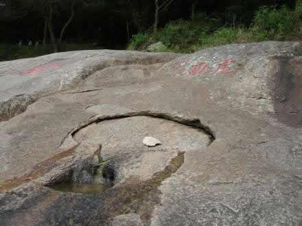 “虎乳泉”旁有“孔泉”石刻。泉眼上下皆石,上石如殼,下石如砥,中坼有孔竅,泉從隙縫里流出,注入一方形石孔中。上有呂道人題刻“虎乳”和宋朱熹撰寫的“源頭活水”石刻!盎⑷槿遍L年不涸,游人耳貼巖石,可聞其巖下傳出“咕咚”的陣陣響聲。