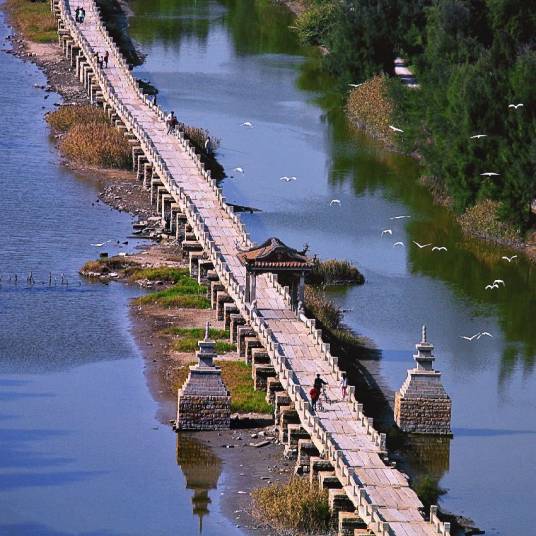 安平橋,曾用名五里橋、西橋、安海橋,是中國(guó)福建省泉州市境內(nèi)連接晉江市和南安市的一座橋梁,是世界上中古時(shí)代最長(zhǎng)的梁式石橋,也是中國(guó)現(xiàn)存最長(zhǎng)的海港大石橋,是古代橋梁建筑的杰作,享有“天下無橋長(zhǎng)此橋”之譽(yù)。