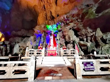 五更天: 前面“天際”出現(xiàn)魚肚白,邊上還有雄雞報(bào)曉石,接著,右前方洞頂閃爍著一顆啟明星。往前走,啟明星變成了半個(gè)月亮。在空氣濕度大、風(fēng)小、洞口外有陽(yáng)光的時(shí)候,半月旁還會(huì)出現(xiàn)一輪像彩虹一般的“佛光”。 |