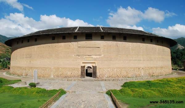 二宜樓:這座被譽(yù)為"國(guó)之瑰寶"的圓土樓,座落在華安縣仙都鎮(zhèn)大地村。仙都、大地,這是多么富有詩(shī)意的名字,其實(shí)二宜樓就是人間天堂的一座民居,就是中華大地的一顆璀璨明珠。 二宜樓依山傍水,樓后峰巒疊嶂,近處山丘綿延,猶如蜈蚣緩緩爬行(風(fēng)水先生稱(chēng)之為"蜈蚣吐珠地");兩條清澈的小溪在樓前交匯后,直奔西南而去。青山綠水,與黃墻黑瓦交相輝映,小橋、樓閣、翠竹、村舍點(diǎn)綴其間,渾然一體,正是"宜山宜水"的一派旖旎風(fēng)光。樓內(nèi)祖廳便有一對(duì)柱楹,專(zhuān)門(mén)概述這一景觀:"倚杯石而為屏,四峰拱峙集邃閣;對(duì)龜山以作案,二水瀠洄萃高樓。" 所謂宜山宜水,其實(shí)還隱寓樓主蔣仕熊排行第二,又是第二次擇地,才選中這蜈蚣吐珠穴位,其得意之情溢于言表。在族人的傳說(shuō)里,蔣仕熊年輕時(shí)是個(gè)種田能手,他身材高大,體格健壯,臂力超人,能使一把廿四斤重的大刀,可惜他人才超群,卻遲遲未能成家,說(shuō)是犯了"孤鸞命",注定一輩子打光棍。族人背地里取笑他說(shuō):"無(wú)某(妻)無(wú)猴,鎖匙掛褲頭。"他一氣之下出走他鄉(xiāng),到安溪、漳平等地開(kāi)墾荒田幾百畝。不久,他遇到了一個(gè)魏氏姑娘,兩人婚配后,生了六個(gè)兒子。蔣仕熊晚年衣錦返鄉(xiāng),開(kāi)始投巨資建樓,由于操勞過(guò)度,他在二宜樓尚未建成時(shí)便不幸逝世,他的六個(gè)兒子、十七個(gè)孫子繼承遺志,艱苦努力,終于在清乾隆35年(1770年)把大樓建成。