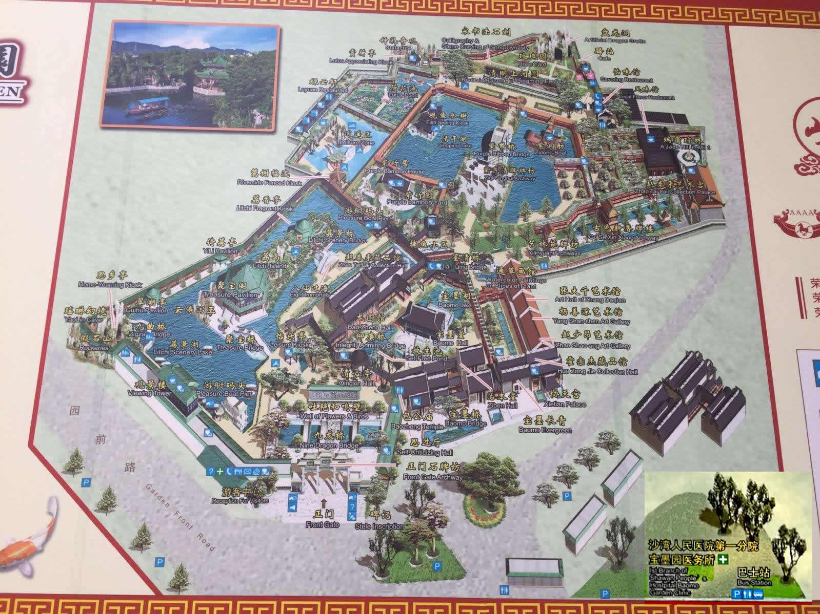 寶墨園內(nèi)共有治本堂、寶墨堂、清心亭、仰廉橋、紫洞舫、龍圖館、千象回廊和風(fēng)味食街這8大景區(qū),40多個景點,30多座石橋,河湖眾多,流水縱橫,建筑、園林、山水、石橋。陶塑、灰塑、石雕、磚雕、木雕、石刻、彩繪、嵌瓷等藝術(shù)精品琳瑯滿目,各展館珍藏、陳列了大批文物古董和名家的書畫。