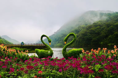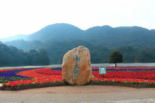 “七彩天池”花海是石灶風(fēng)光區(qū)的天池花海景點國慶期間的一個特色,由多種顏色的花卉共同組成。大紅色的一串紅、金黃色的硫化菊、紫色的千日紅、橙色的百日草、深紅色的紅穗冠、淡黃色的黃穗冠和粉色的朱唇等匯聚成一道亮麗的彩虹,降落在藍天碧水之間,創(chuàng)造出一個七彩斑斕的童話世界。同時,圍繞著這七色花海還有大波斯菊與醉蝶花。紅的,粉的,紫的,白的小花配以音樂等元素造型共同點綴著這幅優(yōu)美的畫卷。“七彩天池”最佳觀賞期為9-11月。