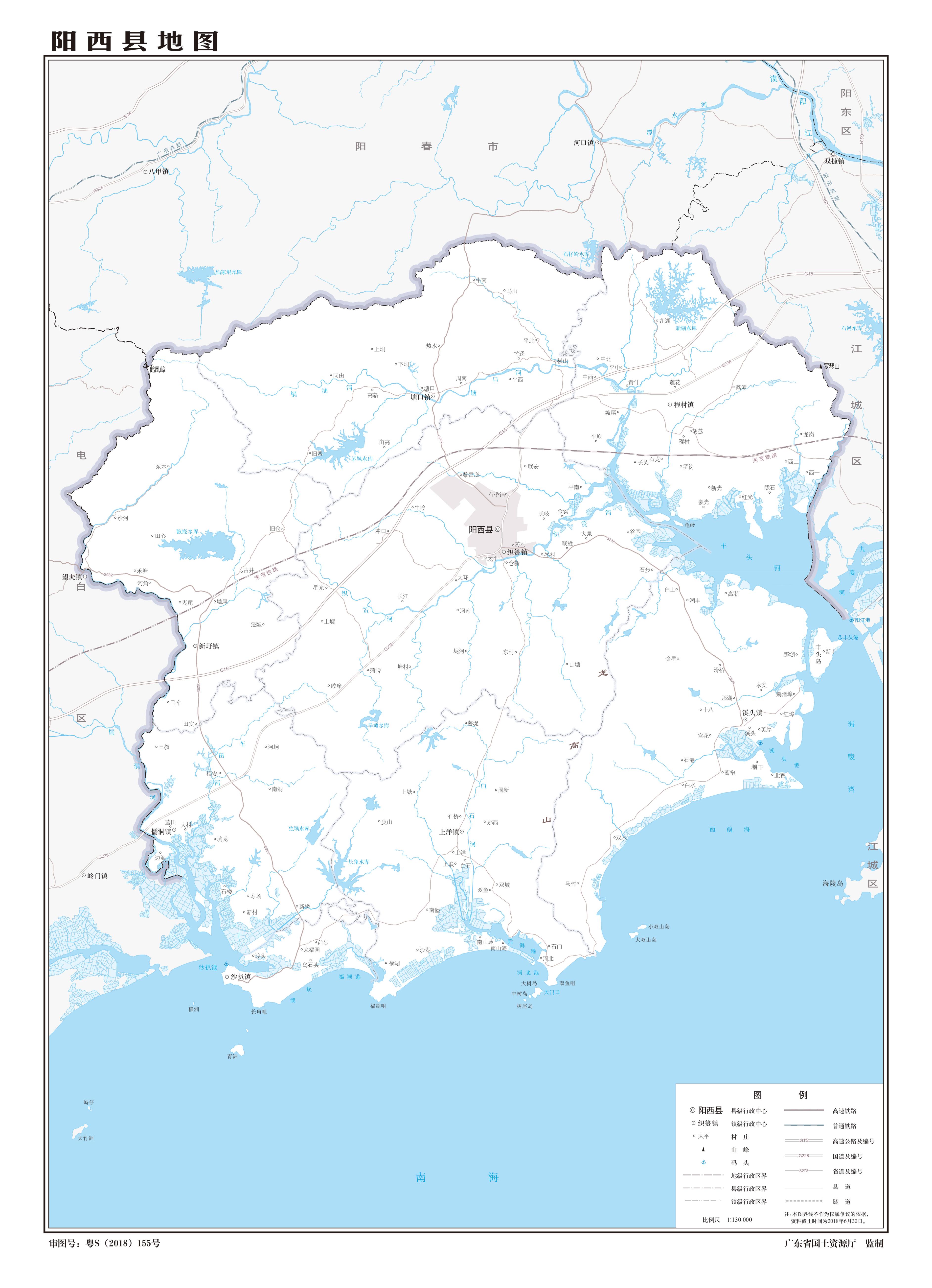 位置境域 陽西縣位于廣東省西南部沿海,地處東經(jīng)111°22'28"至111°48'43"、北緯21°29'至21°55′。東接江城區(qū)、陽東縣,北鄰陽春市,西與電白區(qū)交界,南臨南海。陽西縣總面積1455平方千米。