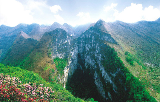 通靈大峽谷:位于靖西縣城東南部32公里的湖潤鎮(zhèn)新靈村,古龍山水源林自然保護區(qū)的南端,由念八峽、銅靈霞、古勞峽、新靈峽、新橋峽組成,總長10多公里。念八河從古龍山脈緩蜒而下,依次穿越五個峽谷,流入湖潤臺地。每個峽谷內(nèi)薈萃了舉世罕見的特高瀑布群、洞中瀑布、地下暗河、峽谷溪流、洞穴奇觀、古石壘、古懸葬、原始植被等自然景觀與人文景觀。