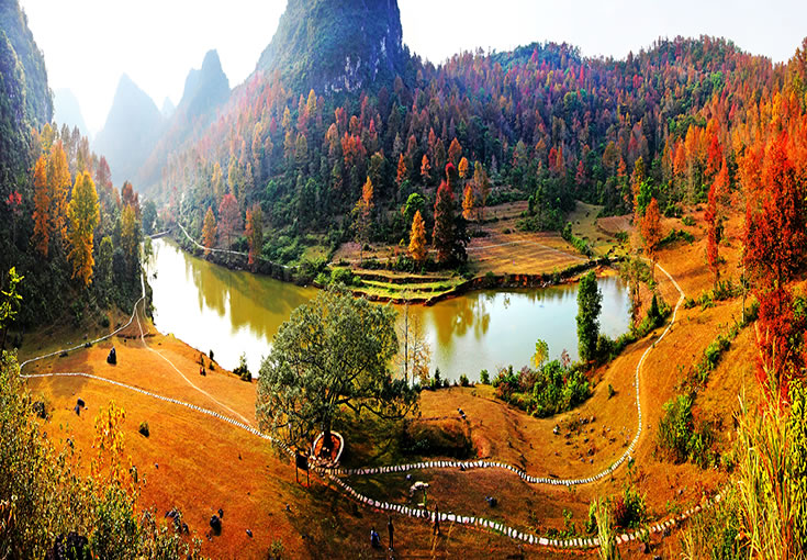 紅葉森林公園位于德保縣東北側方向,國家AAAA級旅游景區(qū)暨自治區(qū)級森林公園,距縣城3.5公里,交通便利。公園規(guī)劃面積1036.5公頃,該公園核心景區(qū)為紅楓湖游覽區(qū)和紅葉谷游覽區(qū),以紅楓為主題。金秋時節(jié),楓葉似火,湖水輕柔,互襯互耀,頗具詩情畫意。公園的紅葉品種主要以楓香為主,葉子顏色分別有深紅、絳紅、霞紅、黃紅混合等,觀賞時間較長,有著“德保楓葉賽九寨”的美譽,是秋季里一道亮麗的風景線。公園以紅楓湖、紅葉谷一帶的紅楓林為依托,襯托著多姿多彩的紅葉森林景觀、森林生態(tài)景觀、底蘊深厚的人文景觀和綺麗迷人的水文景觀,將紅楓湖、上章湖、紅葉谷構成休閑避暑游覽的大旅游圈,景區(qū)內上章水庫和百布水庫交相輝映,總庫容量分別為365萬立方米和190萬立方米;有效灌溉面積分別為2200畝和2000畝。目前,景區(qū)各項基礎設施正在逐步完善。德保境內有10萬多畝連片的紅楓林,遍布城關、那甲、馬隘、巴頭等鄉(xiāng)鎮(zhèn)。除紅葉森林公園外,馬隘至巴頭一線還有許多別具特色的賞楓景點,無一不令人流連忘返。