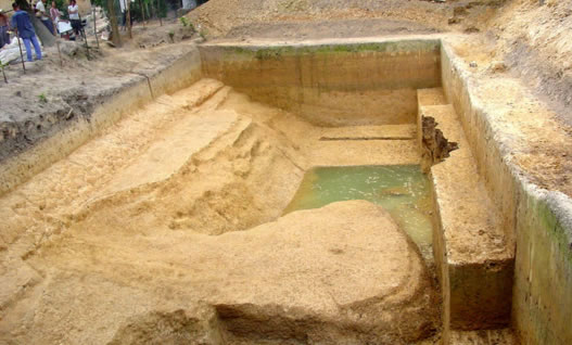 草鞋村遺址位于北海市合浦縣廉州鎮(zhèn)草鞋村,西臨南流江分支—廉州西門江。發(fā)現(xiàn)陶窯、磚窯共22座,建筑遺址5處,水井5口及一批作坊遺跡,呈環(huán)狀分布于遺址臺(tái)地的坡坎四周,初步判定為漢代嶺南地區(qū)重要的官營(yíng)手工業(yè)作坊。