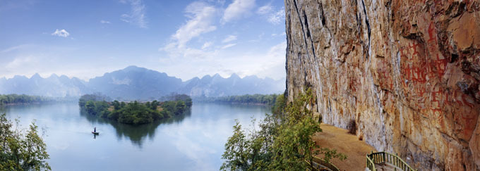 位于縣城西北25千米的明河畔,以其古老神奇的巖畫而聞名中外;ㄉ綆r畫是左江流域巖畫中的代表,也是世界同類巖畫中單位面積最大、畫面最集中、內(nèi)容最豐富、保存最完好的一處巖畫,被譽(yù)為是壯族文化的瑰寶。 1988年,花山巖畫被國(guó)務(wù)院列為全國(guó)重點(diǎn)文物保護(hù)單位。1998年,以花山巖畫為中心的花山風(fēng)景區(qū)被定為國(guó)家級(jí)風(fēng)景旅游名勝區(qū),成為與桂林漓江、桂平西山齊名的廣西三大國(guó)家級(jí)風(fēng)景旅游名勝區(qū)之一。2000年開始,國(guó)家文物局實(shí)施花山巖畫保護(hù)計(jì)劃,對(duì)保護(hù)巖畫進(jìn)行深入研究。2003年6月,寧明縣啟動(dòng)花山巖畫申遺工作。2004年11月,國(guó)家建設(shè)部把寧明縣花山巖畫列入《中國(guó)申報(bào)世界遺產(chǎn)預(yù)備名單》。