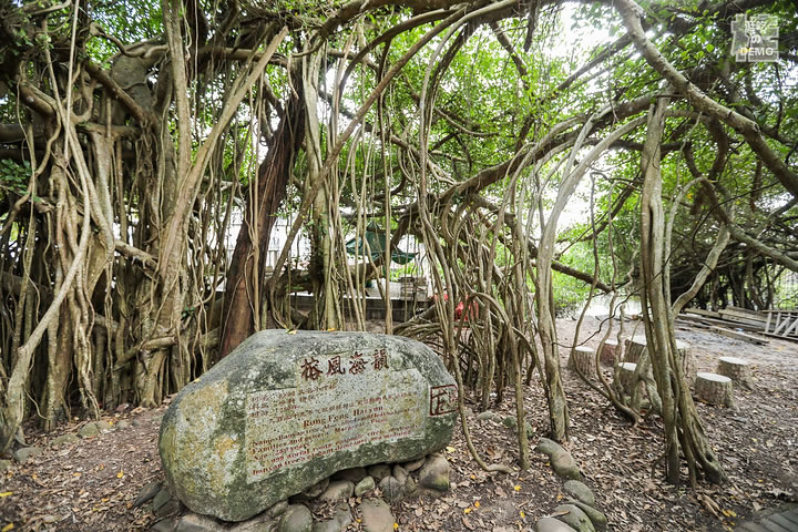 竹山古榕部落由一棵一千三百多年的古榕和眾多小葉榕組成。古榕為高山榕,榕樹高大挺拔,樹干需十三個(gè)成人張開雙臂才能合抱。而這一株株榕樹,也許是海風(fēng)終年吹拂的緣故,榕樹長到一定高度后就橫向生長,長出許多氣根,氣根接觸地面后長成一根根枝干,這樣的氣根不知多少,數(shù)不勝數(shù),遠(yuǎn)遠(yuǎn)望去,一株榕樹就是一片樹林,在綠茵如水的野芋叢中,構(gòu)成了“頃地一古榕,飛瀑掛潭中”的佳景,打造了古榕部落“雙龍出海”、“四郎探母”、“六柱擎天”、“八仙會聚”以及榕樹瀑、榕樹墻、榕樹戀、榕樹侶等惟妙惟肖的生態(tài)奇觀。