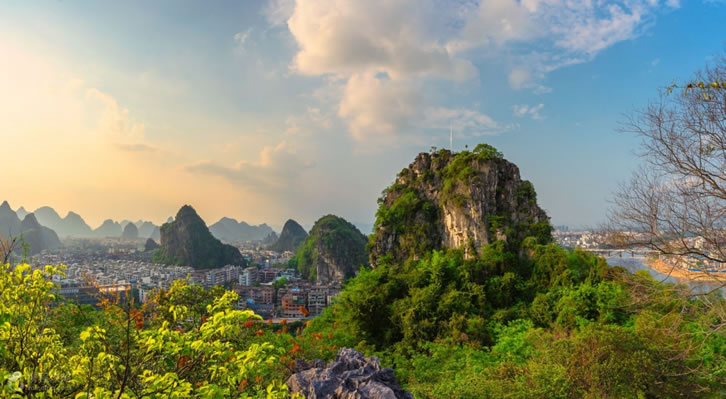 山系 疊彩區(qū)境內(nèi)有堯山、疊彩山、伏波山、虞山等山;有伏龍洲、南洲、螞蝗洲等島嶼;有試劍石、木龍洞、韶音洞、風(fēng)洞、仙鶴洞、瞻鶴洞、還珠洞等奇石異洞。