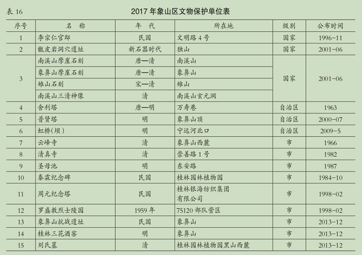 象山區(qū)有全國重點文物保護單位3個,自治區(qū)級文物保護單位3個,桂林市級文物保護單位9個。