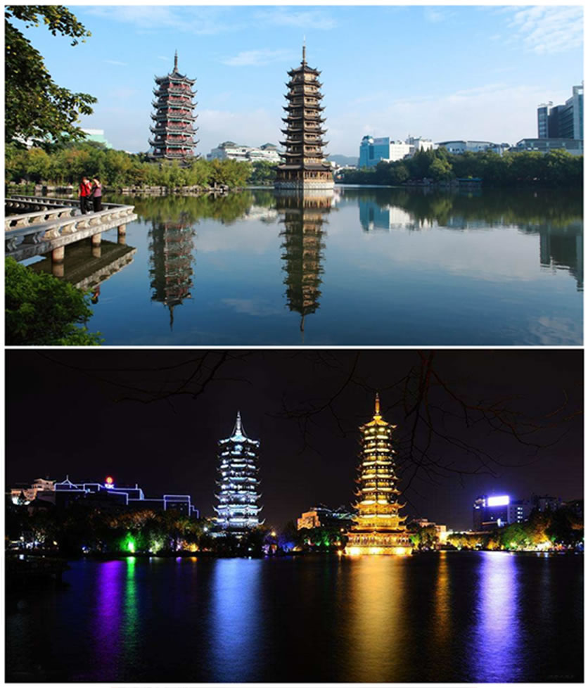 日月雙塔地處桂林市中心區(qū),坐落在桂林城的中軸線上,與“象山水月”相鄰。象山是桂林的城徽,而雙塔則是新桂林的標識。日塔、月塔與象山上的普賢塔、塔山上的壽佛塔,相互呼應,相互映襯,有“四塔同美”之說。桂林日月雙塔號稱世界第一銅塔,是桂林旅游的一個夜景觀賞地。