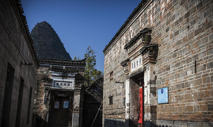在明洪武年間,山東一位被貶的秦姓官員千里跋涉來(lái)到桂北地區(qū),據(jù)村民說(shuō),他們是唐代名將秦瓊的后人。后來(lái)秦氏的一支看中了水源頭村自周的山形地勢(shì),于是選取了這個(gè)“風(fēng)水寶地”落下根基。經(jīng)過(guò)多年繁衍,漸成規(guī)模。在后籠山下,依山勢(shì)拾級(jí)而建成了成片的大宅子,當(dāng)?shù)厝朔Q其為“秦家大院”。這些宅子基本為三進(jìn)三開(kāi),房屋分為四組,組與組間隔兩米,形成狹長(zhǎng)的巷道,均以青石板鋪筑。宅子的高堂、戲院、花廳都敞開(kāi)大門(mén),兩旁房子的大門(mén)朝里開(kāi),很有意思。宅子的墻壁都以幾噸重的青石方墩為基,砌上1米多后,改用青磚砌至屋頂,很獨(dú)特。高大敞亮的上層樓房,窗戶上鑲嵌的窗花是琉璃瓦燒制而成,上面還畫(huà)著花卉,溫婉中透著古色古香。房中的板壁上刻著各種花紋的圖案,庭柱下的石礅上鑿有龍鳳的花飾,精細(xì)美觀。